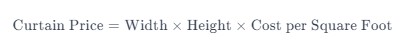The formula used in the Curtain Price Calculator combines the dimensions of the window and the cost per square foot of the chosen fabric. The formula is as follows: